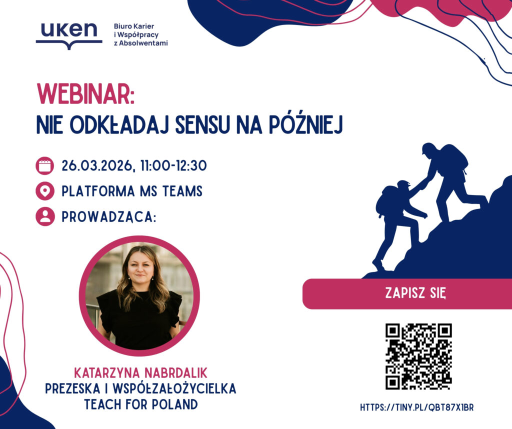 Jeśli to pytanie jest Ci bliskie, serdecznie zapraszamy na webinar Biura Karier i Współpracy z Absolwentami oraz Fundacji Teach for Poland pt. „Nie odkładaj sensu na później”.
