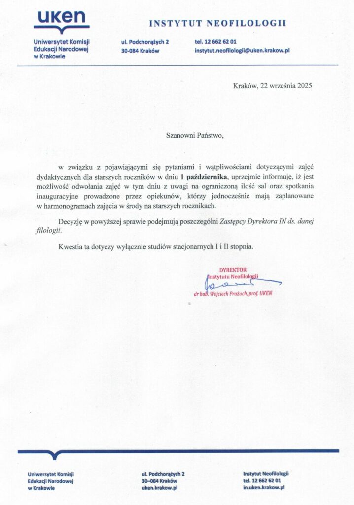 W dniu 9 października 2025 roku od godziny 9.00 do 13.00 ogłoszone zostają godziny rektorskie dla studentów I roku studiów biorących udział w spotkaniu powitalnym dla studentów I roku.